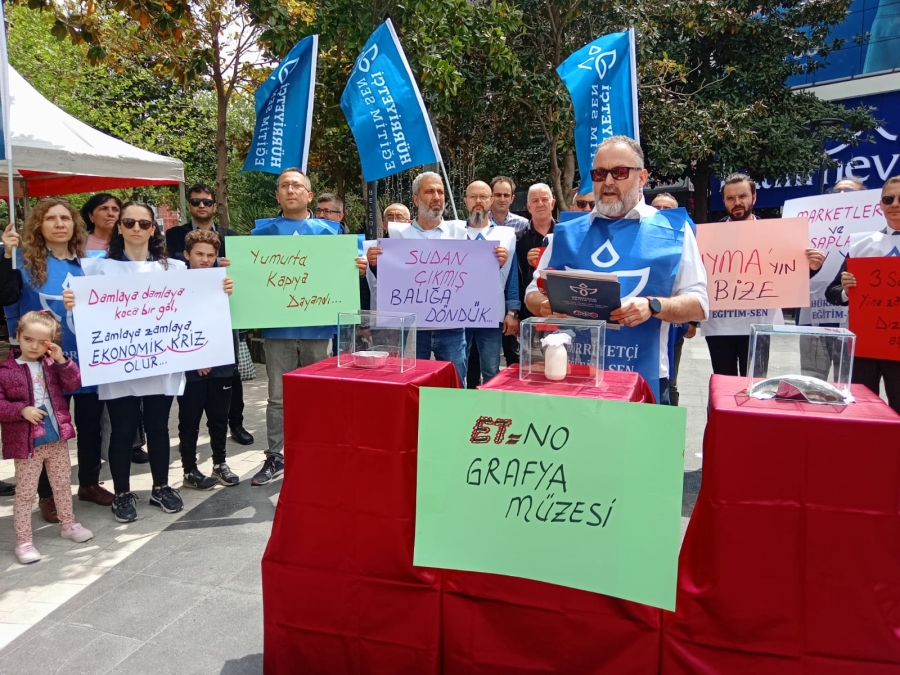 TÜİK verilerine göre bile yüzde 50.5 reelde ise yüzde 115’lere ulaşan enflasyon rakamları Mart Ayı yoksulluk sınırı olan 33.754 TL ve açlık sınırı olan 9752 TL ile yan yana koyulduğunda daha da anlam kazanmaktadır. Sayın Bakan Vedat Bilgin’in bir TV programında bahsettiği gibi eğitim çalışanları en az 20.000 TL almamaktadır. 30 yıl üzeri çalışan ve 10.000-14.000 TL civarı maaş alan yüzbinlerce eğitim çalışanının da sesi olmak için burada toplanmış bulunmaktayız. Sembolik olarak hazırlamış olduğumuz “Et, Balık, Süt Ürünleri Müzesi”nin de açılışını iftiharla değil ne yazık ki utanarak yapıyor olacağız.