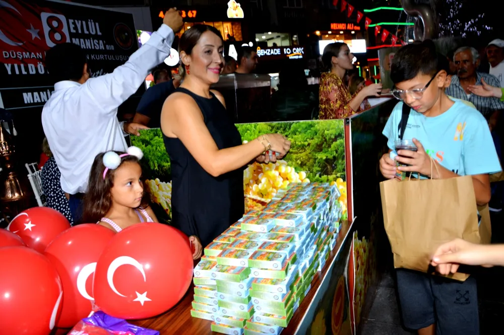 15 Temmuz Demokrasi Meydanı’nda düzenlenen etkinlikte Şehzadeler Belediyesi Mehteran Takımı da konser verdi. Manisa’nın düşman işgalinden kurtuluşunun 101. yılını kutladıklarını belirten Manisa Ticaret Borsası Başkanı Sadık Özkasap, “Manisa için 8 Eylül’ün çok büyük bir anlamı var. Kurtuluşumuzun 101. yılını kutluyoruz. Burada hep beraber Manisa’nın bugüne vermiş olduğu değer çok önemli. Manisa Valimiz ve fener alayıyla beraber halkımızla buraya geldik. Biz de Manisa Ticaret Borsası olarak istedik ki her yıl bunu geleneksel hale getirelim. Bir taraftan Manisa’mızın Sultani çekirdeksiz kuru üzümünü hem yaş olarak halkımıza dağıtıyoruz. Bugün yine üzüm şırası ve kuru üzüm dağıtıyoruz. Bugünü ayrı bir şenlik havasında kutlamak istiyoruz. Bizim için mücadele veren ecdadımızı rahmetle anıyoruz. Mücadelelerinden dolayı müteşekkiriz. Manisa’mızın kurtuluşunun 101. yıl dönümü vatandaşlarımıza hayırlı olsun diliyoruz” dedi. Oldukça ilgi gören etkinlikte vatandaşlar şıra alabilmek için uzun kuyruklar oluşturdu. Başkan Sadık Özkasap, borsa personeli ve Manisa’nın yöresel kıyafetlerini giyen genç kızlar etkinlikte toplam 2,5 ton yaş üzüm ve 250 litre şıra dağıttı.