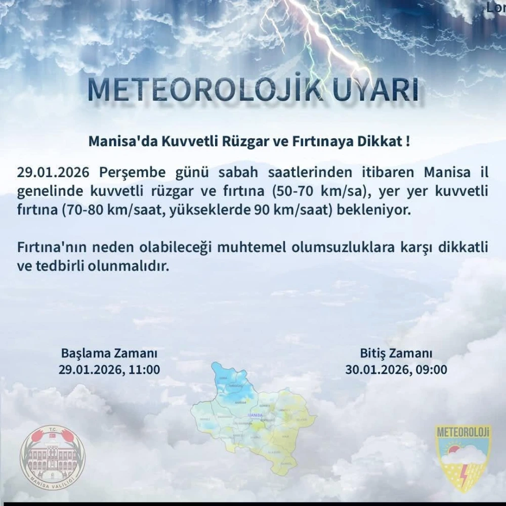 Manisa için yayımlanan uyarıda, rüzgar hızının saatte 50-70 kilometre arasında olacağı, bazı bölgelerde ise 70-80 kilometreye kadar çıkabileceği kaydedildi. Özellikle kentin yüksek kesimlerinde rüzgar hızının 90 km/saat seviyelerine ulaşmasının beklendiği ifade edildi. Kuvvetli rüzgar ve fırtınanın 29 Ocak Perşembe günü saat 11.00 civarında etkisini göstermeye başlayacağı, 30 Ocak Cuma sabahı 09.00’a kadar zaman zaman şiddetini koruyacağı tahmin ediliyor.