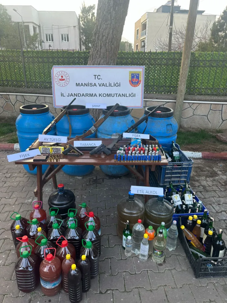 Operasyonda yapılan aramalarda 2 adet ruhsatsız tabanca, 187 adet tabanca fişeği, 3 adet ruhsatsız av tüfeği ve 86 adet av tüfeği fişeği ele geçirildi. Ayrıca, F.E.'nin evinde 1215 litre kaçak şarap ve H.Ç.'nin evinde ise 180 litre etil alkol de bulundu.