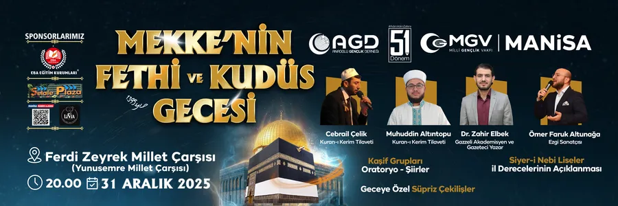 (MHA) - Anadolu Gençlik Derneği (AGD) ve Milli Gençlik Vakfı (MGV) Manisa Şubesi, her yıl geleneksel olarak düzenlenen “Mekke’nin Fethi ve Kudüs Gecesi” programı için hazırlıklarını tamamladı. AGD Manisa Şube Başkanı Hüseyin Eroğlu, 31 Aralık 2025 tarihinde gerçekleştirilecek olan bu anlamlı etkinliğin, milletin ve ümmetin içinden geçtiği hassas dönemde manevi bir dirilişe vesile olacağını belirtti. Eroğlu, programın sadece tarihi bir anma değil, aynı zamanda ümmetin hafızasını tazeleyen büyük bir buluşma olacağını vurguladı.