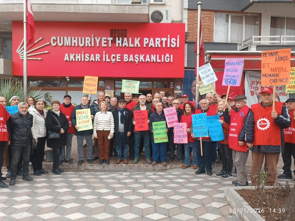 CHP İlçe Lokali önünde gerçekleştirilen açıklamayı DİSK Emekli-Sen Akhisar Şube Başkanı Turgay Kanat okudu. Emeklilerin yaşam koşullarına dikkat çekilen açıklamada, hükümetin bütçe tercihleri eleştirilerek “Sarayın sefalet bütçesini kabul etmiyoruz, emekliye sadaka değil insanca yaşam hakkı istiyoruz” denildi.